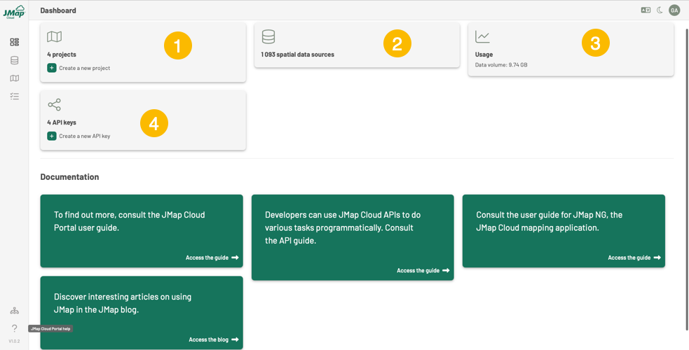 <table data-header-hidden><thead><tr><th width="93" align="center" valign="top"></th><th></th></tr></thead><tbody><tr><td align="center" valign="top">1</td><td><p><strong>Projects</strong><br>Displays the number of projects you can access, either because you are the owner or because you have permission to access them.</p><p>You can create a new project using the <strong>Create new project</strong> button <img src="https://3291879974-files.gitbook.io/~/files/v0/b/gitbook-x-prod.appspot.com/o/spaces%2F9n1KCuTyIKwSpZcPcC6l%2Fuploads%2FOVFQFMtEEtw32h0Nq3g1%2Fbouton-add.png?alt=media&#x26;token=d145a03c-cb08-46af-bee6-14865424ac5c" alt="" data-size="line">.</p></td></tr><tr><td align="center" valign="top">2</td><td><strong>Data Sources</strong><br>Displays the number of data sources you can access, either because you are the owner or because you have access permissions.</td></tr><tr><td align="center" valign="top">3</td><td><p><strong>Usage</strong><br>Displays the organization’s data usage.</p><p>The calculation includes files, database storage, converted raster files, and vector tile caches.</p><p>Only members with the <strong>Administrator</strong> role can see this card.</p></td></tr><tr><td align="center" valign="top">4</td><td><p><strong>API Keys</strong><br>Displays the number of API keys configured by your organization.</p><p>Only members with the <strong>Administrator</strong> role can see this card.</p><p>You can create a new API key using the <strong>Create new API key</strong> button <img src="https://3291879974-files.gitbook.io/~/files/v0/b/gitbook-x-prod.appspot.com/o/spaces%2F9n1KCuTyIKwSpZcPcC6l%2Fuploads%2FOVFQFMtEEtw32h0Nq3g1%2Fbouton-add.png?alt=media&#x26;token=d145a03c-cb08-46af-bee6-14865424ac5c" alt="" data-size="line">.</p></td></tr></tbody></table>