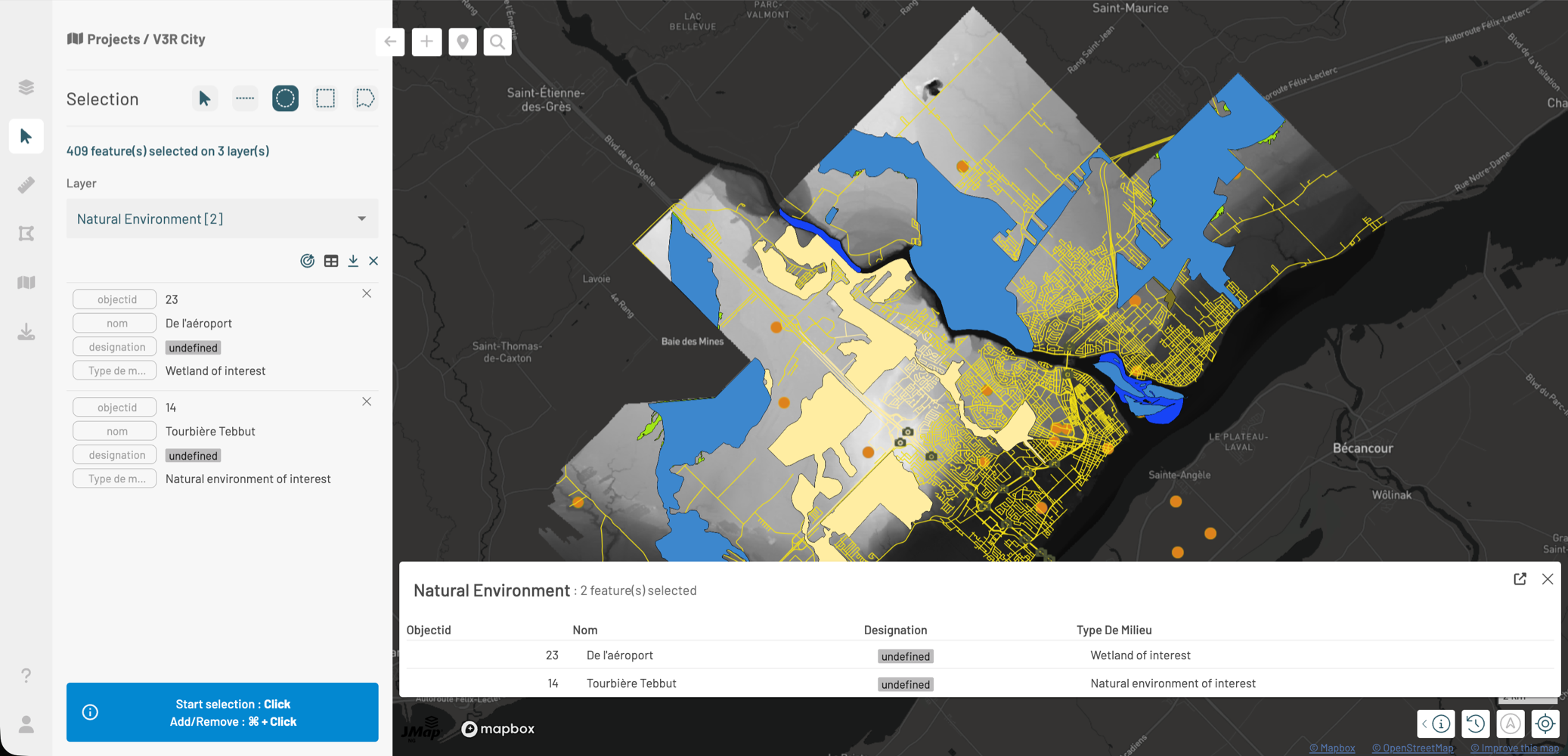 As you select features, their information appears in the Selection panel.