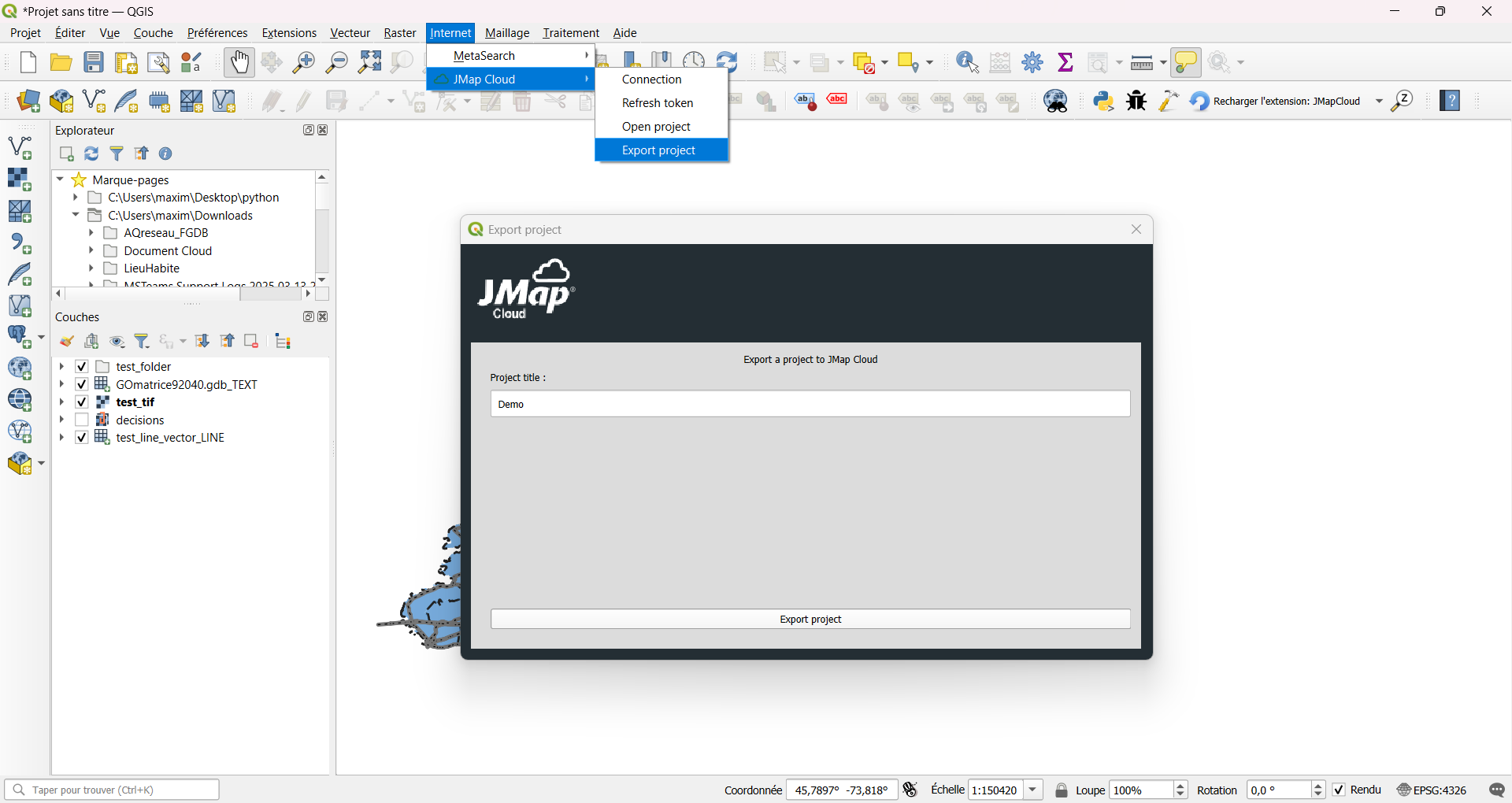 Vous pouvez créer un projet en QGIS à partir des fichiers locaux ou d'autres sources de données et l'exporter vers JMap Cloud.