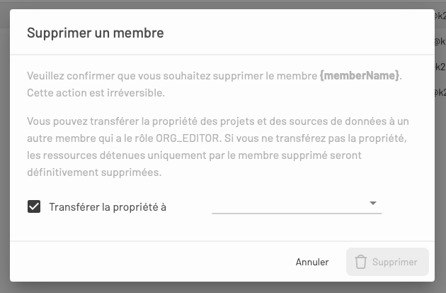 Cochez l’option Transférer la propriété à, puis sélectionnez un autre membre dans la liste déroulante pour lui assigner les ressources du membre supprimé.